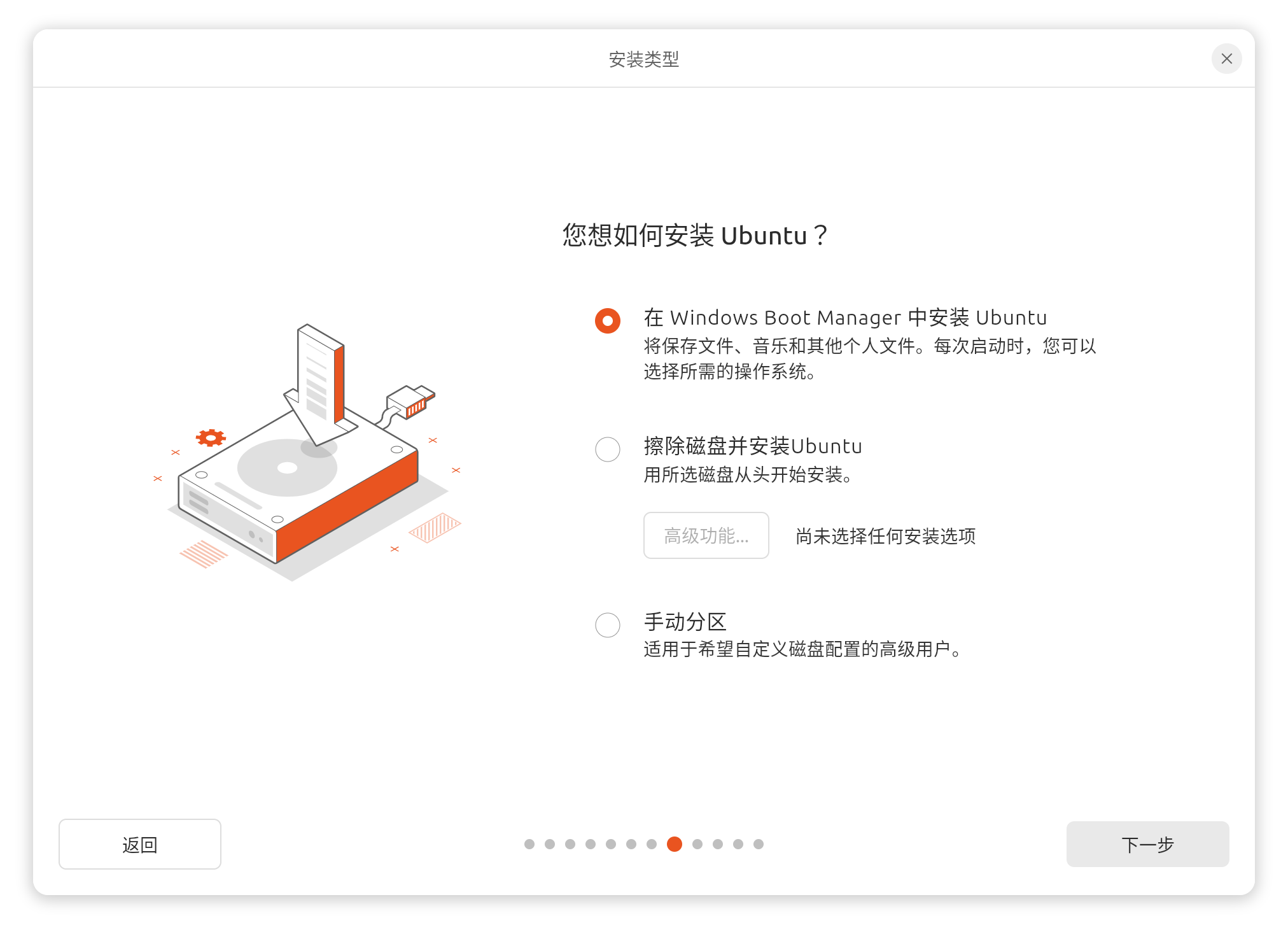 以上两种安装方式ubuntu会给你自动完成,几乎不需要操作,还有一种方式是手动分区,这种方式比较高级且容易损失数据,请百度后再操作;